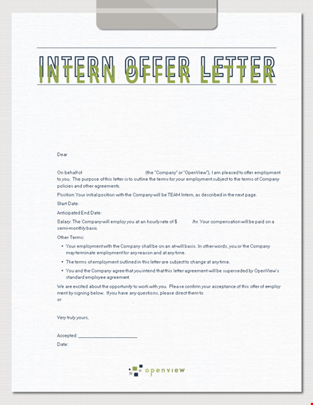 - Confirmation of Acceptance: Once the candidate accepts the offer, the offer letter provides a written agreement that solidifies the intern's commitment to the role and ensures they understand and agree to the terms of the internship.