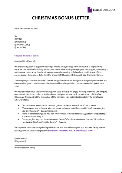 - Once again, we are celebrating the Christmas season and spreading holiday cheer to all. By way of this, please accept the enclosed check in the amount of {{Currency}} {Amount}} as a Christmas Bonus.