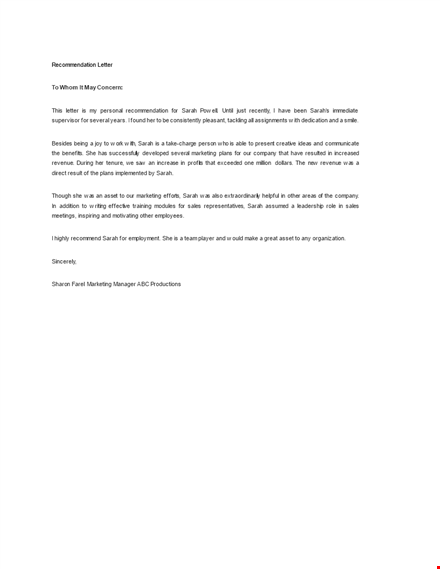 A letter of recommendation is an opportunity for you, as Sarah's supervisor, to highlight her strengths, skills, and accomplishments. As a marketing professional, Sarah has likely brought tremendous value to your organization and deserves recognition for her contributions. Here are some reasons why you might consider writing a letter of recommendation: