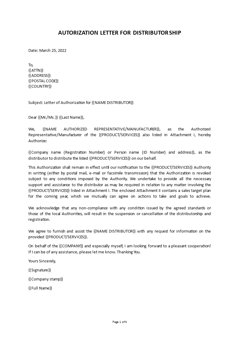 - Subject: Letter of Authorization for {{NAME DISTRIBUTOR}}