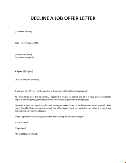 If you want to decline a job offer, for example, because the current employer gave you a better offer, the new job requires you more traveling or long commute, than you can accept, or due to salary, make sure that you are honest but also diplomatic. It's possible that you have had several job interviews and a few companies, and you received 2 or more job offers.