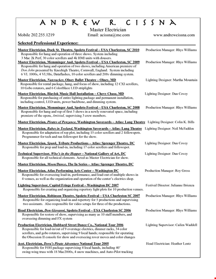 A Master Electrician Contract is a legal document outlining the terms and conditions of the Master Electrician's services, such as their duties, responsibilities, and scope of work. It establishes a clear understanding between the electrician and the festival regarding the agreed-upon services and payment terms. Here's what a Master Electrician Contract typically includes:
