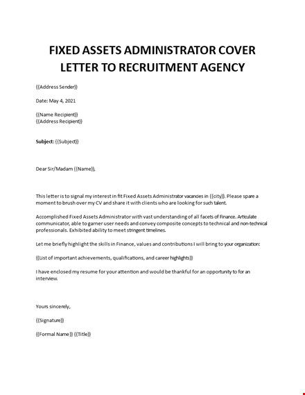 This letter is to signal my interest in fit Fixed Assets Administrator vacancies in {{city}}. Please spare a moment to brush over my CV and share it with clients who are looking for such talent.