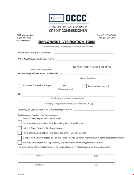 - Compliance with Lending Regulations: Mortgage lenders are required to comply with various lending regulations, such as those set by the Office of Consumer Credit Commissioner (OCCC) in Texas. Employment verification helps lenders ensure compliance with these regulations.