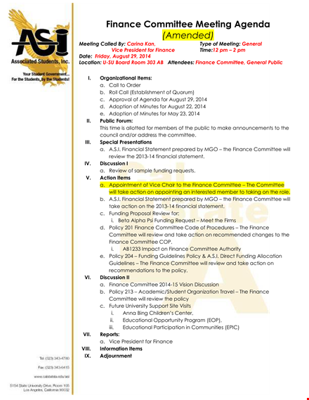 The Finance Committee Meeting Agenda template provides a comprehensive outline for your committee's discussion. It includes key items such as: