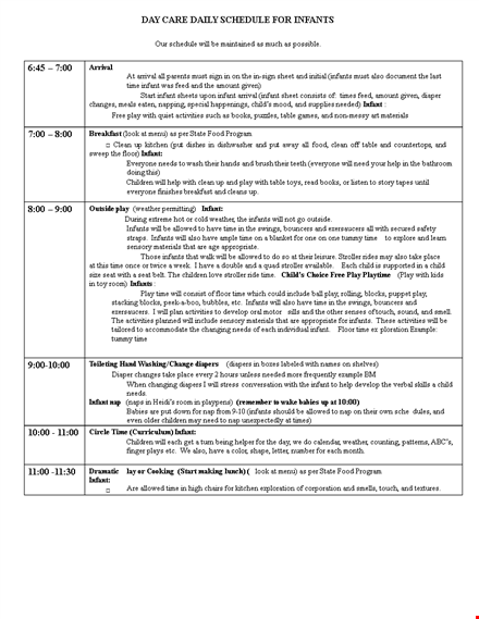 Visit our website today to access a variety of document templates catering to different business needs, including daycare contracts, enrollment forms, and more. Download the Infant Daycare Schedule Template now and give the infants in your daycare the best possible start in life!