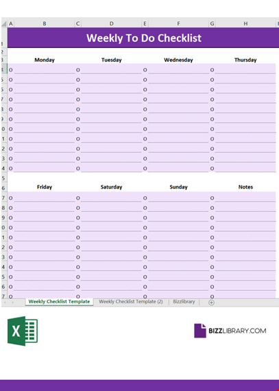 An important effect writing down activities on lists has on people is that they start to organize better, save more time, are more focussed, and finish more tasks. Therefore, we highly recommend working with a checklist. There's no need to make such useful checklist lists from scratch. Bizzlibrary has already done that for you. This checklist is easy to use, or modify, and according to personal needs. You may use this basic To-Do List, which includes the days of the week, and a special 'Notes' section.