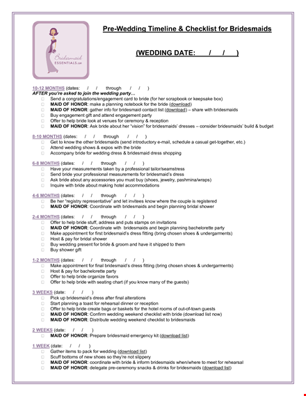 - Delegate Responsibilities: As a bridesmaid, you have specific duties to fulfill, such as assisting the bride, managing logistics, and supporting the wedding party. A checklist helps you assign tasks and delegate responsibilities.