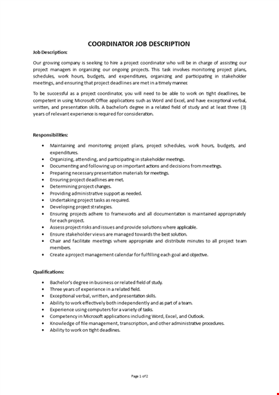 An effective project management job description is vital when attracting the right talents. Use this Coordinator Job Description template for your inspiration when you need to create a job posting that is clear and concise.