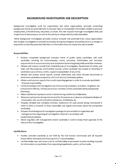Background investigators work for corporations and other organizations, primarily conducting background checks on potential hires to discover false or misreported information related to previous employment, criminal history, education, or credit. This role requires thorough investigative skills and a high level of data analysis, as well as the ability to independently verify the information.