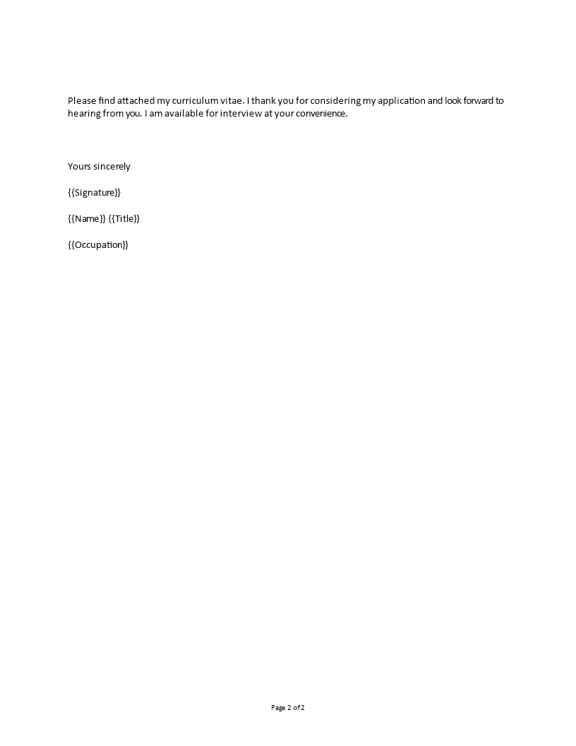 - Thank you for taking the time to review my CV and for your consideration. I enclose the following names as referees: {{Reference 1}} and {{Reference 2}}. Please find attached my curriculum vitae.
