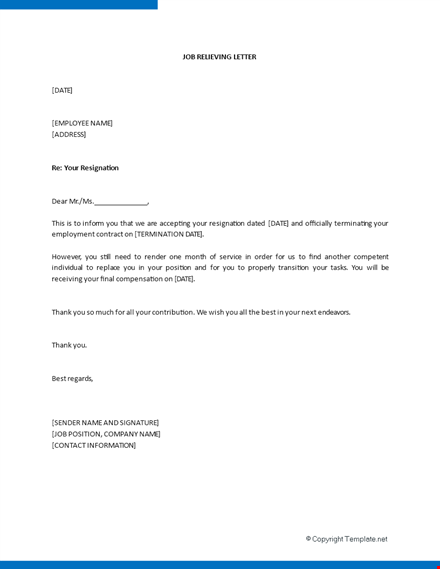 - Completeness: A relieving letter serves as proof that the employee has served their notice period and that all pending dues have been cleared. It also provides details about the employee's position and their resignation date, ensuring completeness of the employee's records.