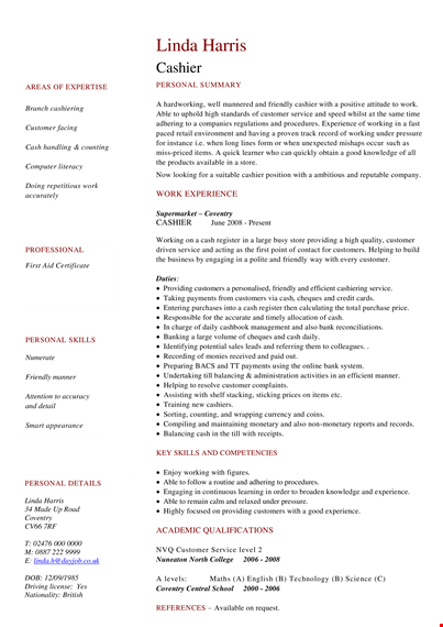 - Highlight Relevant Skills: The template is specifically tailored for customer service positions, making it easier for you to emphasize your customer service skills and experiences. It allows you to showcase your ability to handle cash transactions, provide personal and friendly customer service, and work effectively as a cashier.