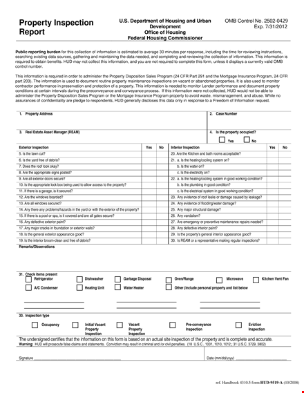 - HUD Requirements: For certain property transactions, such as those involving federal loan programs, a Property Inspection Report may be required to meet the specific guidelines set by the Department of Housing and Urban Development (HUD).