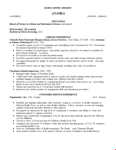 A librarian organizes, sorts, issues and collects various resources and materials, like films, audio files, and books stored in a library. There are a wide variety of environments they may work in, which can include museums, schools, and public libraries. If you're looking to land the right Librarian job, then you need the perfect resume.