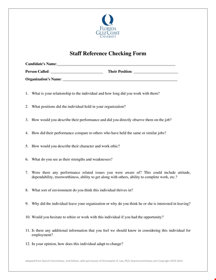 Staff Reference Checking Form - Assessing Performance and Organizational Fit