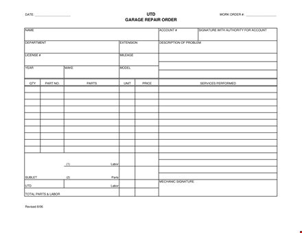 - Accurate Documentation: A Garage Repair Order ensures that all repair and maintenance details are clearly documented, including the customer's vehicle information, the specific repairs or maintenance requested, and the parts and labor involved.