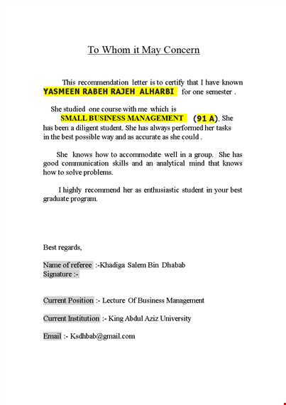 Recommendation Letter for a Position
