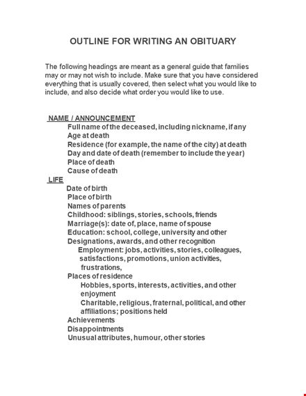 Writing an obituary is a way to pay tribute to your loved one and share their life journey with others. It allows you to honor their memory while also informing friends, family, and the community about their passing. Visit BizzLibrary.com now and access our obituary wording sample to create a heartfelt and memorable tribute to your loved one.