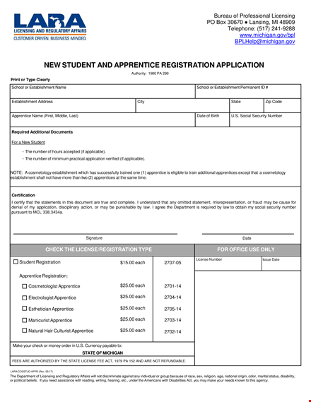 If you are an aspiring cosmetology apprentice and looking to establish yourself in the industry, understanding the licensing requirements is crucial. In the state of Michigan, the Licensing and Regulatory Affairs (LARA) Cosmetology Board oversees the regulation and registration of cosmetology establishments and apprentices. To help you navigate this process smoothly, we offer a comprehensive Lara Cosmetology License apprentice registration document that you can download in PDF format.