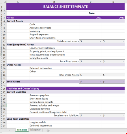 The easy way to make a Balance Sheet in Google Sheets, is by starting with an existing template. This file can be downloaded freely and directly to your server. Editing from there is easy. The following items are included in the balance sheet: