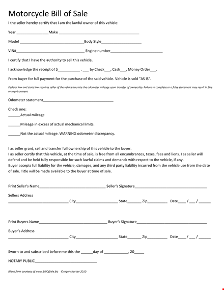 Printable Motorcycle Bill Of Sale Template - Vehicle Seller Buyer