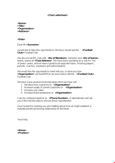 - Opportunity: Clearly outline the sponsorship opportunity and the benefits it offers to the potential sponsor. Explain how their support will contribute to the success of your club and the positive exposure they will receive in return.