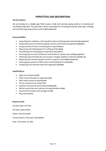 Since well defined descriptions will attract more suitable candidates for the position, we recommend you to use this Pipefitter job description sample. Customize it according to your needs, and then publish it directly to your page and network, you will soon start receiving Resumes and Cover letter from qualified candidates. This Pipefitter Job Description template is fully customizable and can be used in Google Docs, MS Word format. Get this printable file now and personalize it according to your needs. If this is not the job description that fits your need, also have a look at many of our other examples of job description templates here.