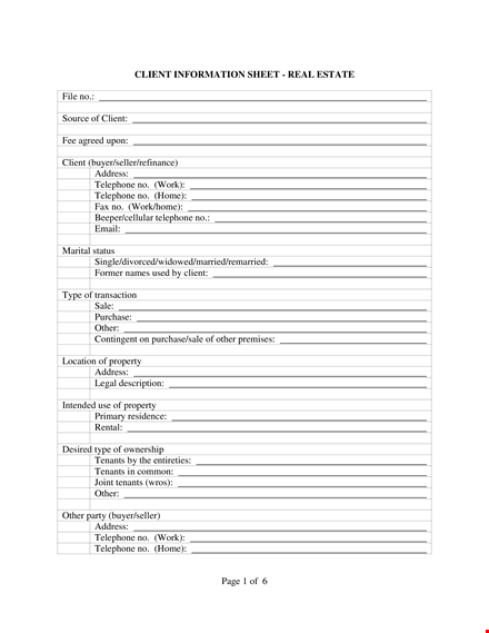 - Personalized Customer Service: By understanding your clients' needs, preferences, and interests, you can tailor your services to provide a personalized experience. The client information sheet allows you to document their preferences, budget, and desired property features, enabling you to find the perfect match for their requirements.