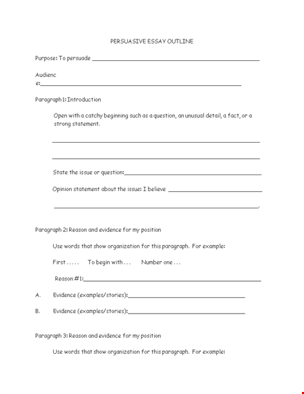 To make the essay writing process even easier, download our persuasive essay outline example in DOCX format. This template provides a pre-formatted structure that you can fill in with your own arguments and evidence, making it an invaluable resource for any persuasive essay writer.