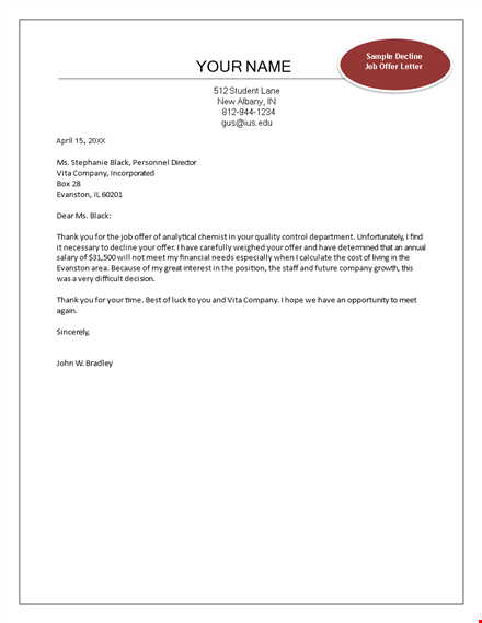 - State Your Decision: Clearly state that you have decided to decline the job offer. No need to go into extensive detail about your reasons.