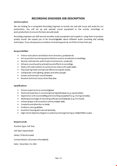 Since well defined descriptions will attract more suitable candidates for the position, we recommend you to use this Recording Engineer job description sample. Customize it according to your needs, and then publish it directly to your page and network, you will soon start receiving Resumes and Cover letter from qualified candidates. This Recording Engineer Job Description template is fully customizable and can be used in Google Docs, MS Word format. Get this printable file now and personalize it according to your needs. If this is not the job description that fits your need, also have a look at many of our other examples of here.