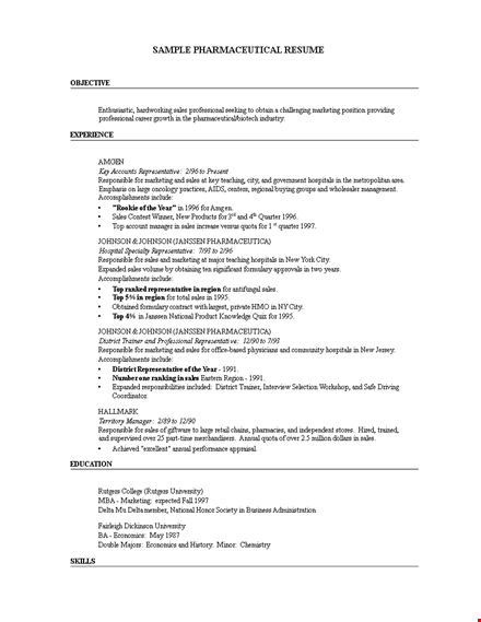 - Highlight Your Experience: Your resume should outline your previous experience in the pharmaceutical industry, whether it's in a retail pharmacy, hospital setting, or other healthcare environments. Emphasize any relevant achievements or responsibilities that demonstrate your ability to excel in the sales representative role.