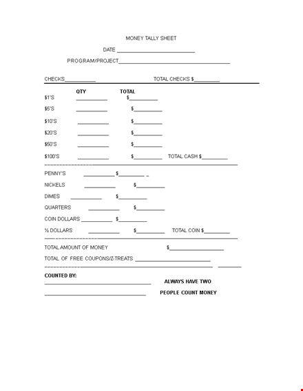 Need a convenient way to keep track of your cash and checks? Look no further! BizzLibrary.com offers a comprehensive Money Tally Sheet Template that allows you to easily record and tally your money transactions. Whether you're managing your personal finances or a small business, this template is a valuable tool to help you stay organized and in control of your finances.