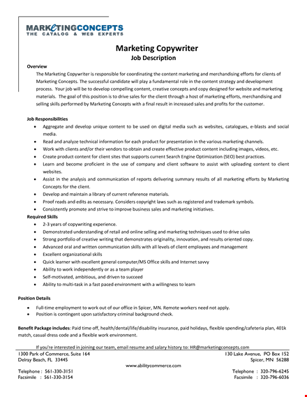 If you have a passion for writing and a knack for persuasive language, then a career as a Marketing Copywriter may be the perfect fit for you! At BizzLibrary.com, we understand the importance of having a well-crafted job description to attract top talent. That's why we have created a comprehensive Marketing Copywriter Job Description template to help you find the right candidate for your marketing team.