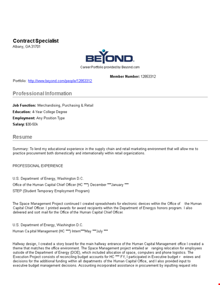 Resume for Contract Specialist: Office, College, and Student Management Within