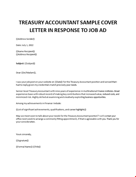 Dear {{Sir/Madam}}, I saw your job post on your website on {{Date}} for the Treasury Accountant position and sensed that I had to reply given my credentials match precisely your needs. Senior-level Treasury Accountant with nine years of experience in multinational Finance institutes. Broad experience base with robust record of making key contributions that increased value, reduced costs, and minimized risk. Highly skilled at examining and creatively exploiting business opportunities. Among my achievements in Finance I include: {{List of significant achievements, qualifications, and career highlights}} May we meet soon to talk about your needs for the Treasury Accountant position? I will contact your office next week to arrange a commonly fitting appointment, if that is agreeable with you. Thank you for your consideration. Yours sincerely,