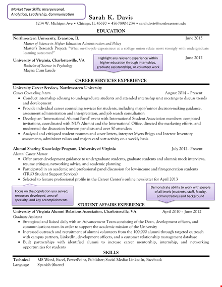- Highlight Your Experience: If you have relevant work experience or internship positions in higher education, the resume provides an opportunity to highlight your roles, responsibilities, and accomplishments in these roles. This can include research projects, teaching assistantships, administrative support, or leadership positions.