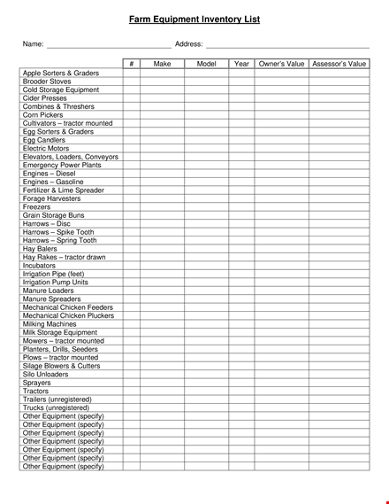 Our Farm Equipment Inventory List Template is specifically designed to meet the unique needs of farmers and agricultural businesses. It provides a user-friendly and customizable format to specify essential details about your equipment, including: