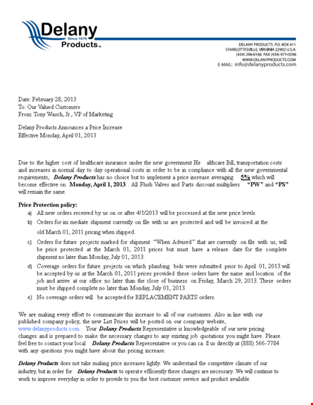 Important: Changes to Our Product Prices and Orders | Delany Price Increase Letter