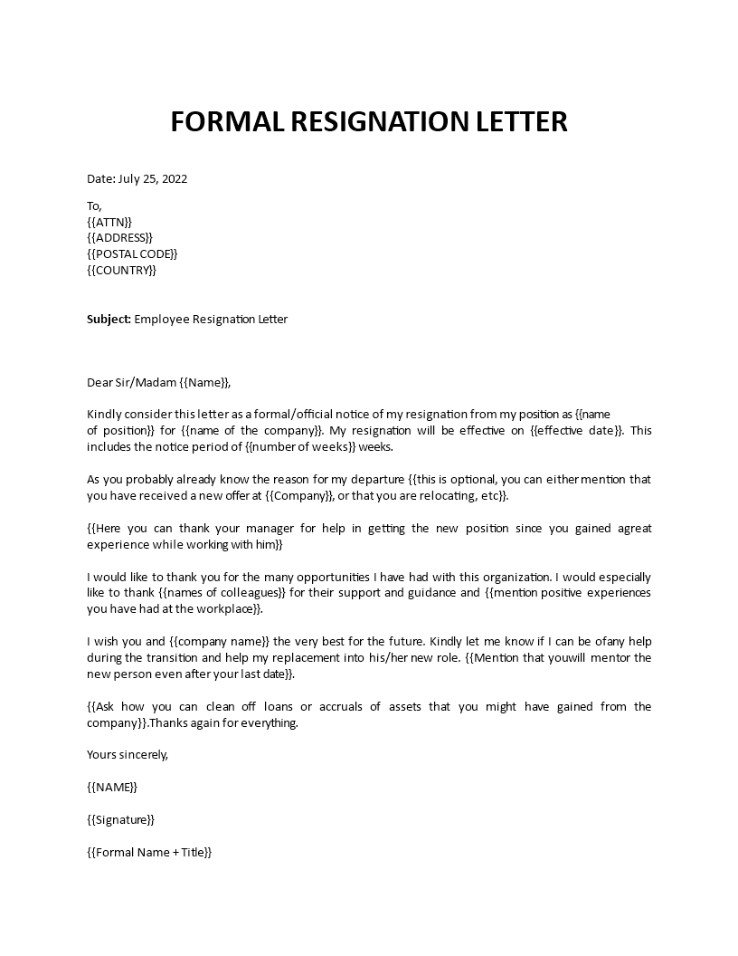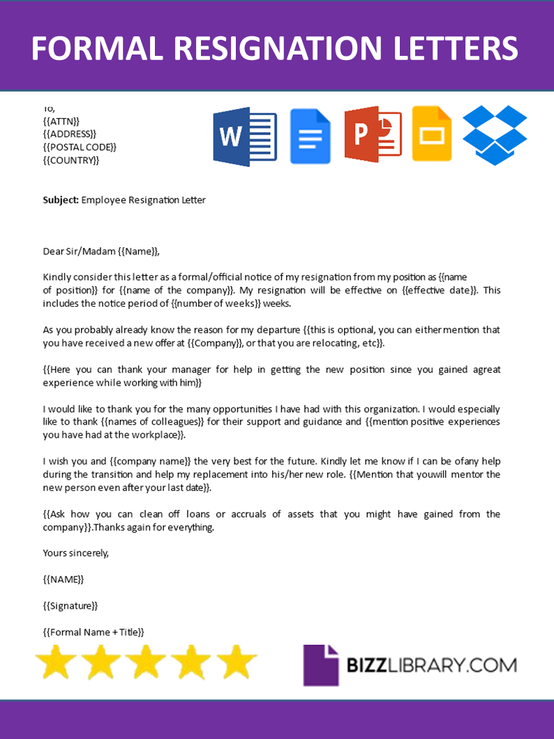 Yours sincerely,Download this formal resignation letter template for free and modify the blank fields or content according to your preferences and send it directly to your manager or management team. Make changes to the document according to your preferences. If you like this letter, please give us a big thumbs up. Your valuable feedback matters a lot to us. Head towards our website for some useful content. For more resignation letters, or other useful content, please visit our website.