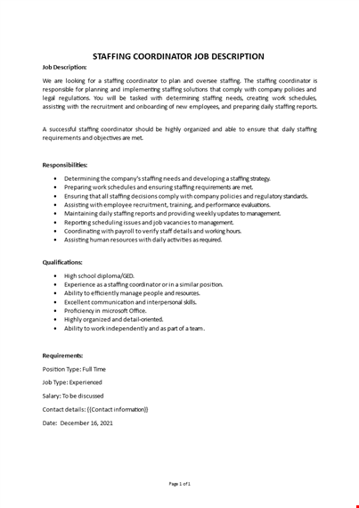 An effective and compelling staffing coordinator job description is vital when recruiting the right job candidates. By using a professional job description template, there is no need to start from scratch. It saves time, and by editing this job description template, you will be able to attract the most qualified job candidates for the open position.