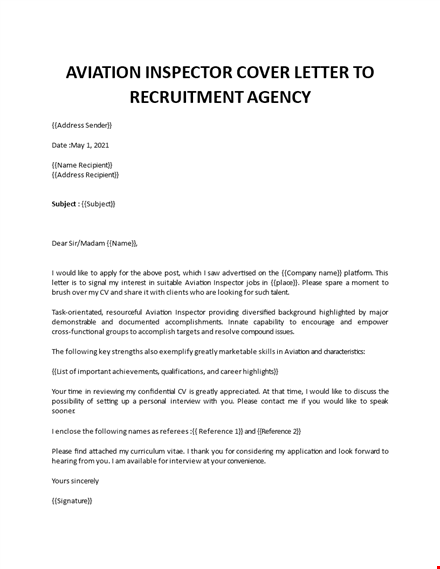 I would like to apply for the above post, which I saw advertised on the {{Company name}} platform. This letter is to signal my interest in suitable Aviation Inspector jobs in {{place}}. Please spare a moment to brush over my CV and share it with clients who are looking for such talent.