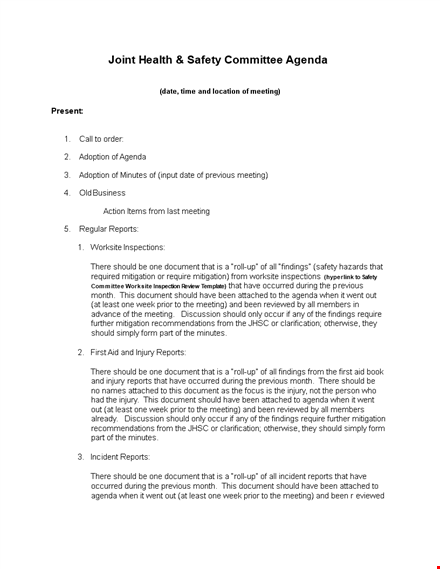 - Organization and Focus: The agenda outlines the topics to be discussed during the meeting, ensuring that all important aspects of health and safety are covered. It helps to keep the meeting organized and focused, maximizing productivity and effectiveness.